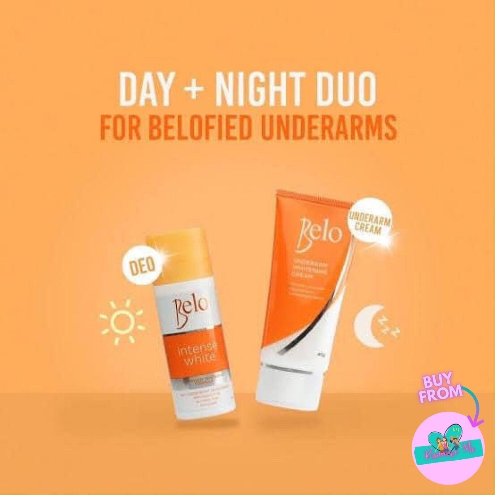 Intense White Deo - fights sweat, body odor, and reduces underarm pigmentation for everyday freshness and confidence✨ Whitening Cream - intensively lightens underarm discoloration and hyperpigmentation, giving you visibly brighter underarms• Prevents redness (erythema) caused by habitual plucking and shaving• Lightweight and non-sticky• Expertly formulated•Alcohol-free. Paraben-free. Hypoallergenic. Dermatologist-tested.Every morning, I apply BeloUnderarm Intense White Deo. At night, I pamper my underarms with BeloUnderarm Whitening Cream! ✨ Package includes: (1) Belo Underarm Roll-on Deodorant and (1) Belo Underarm Whitening Cream 40g