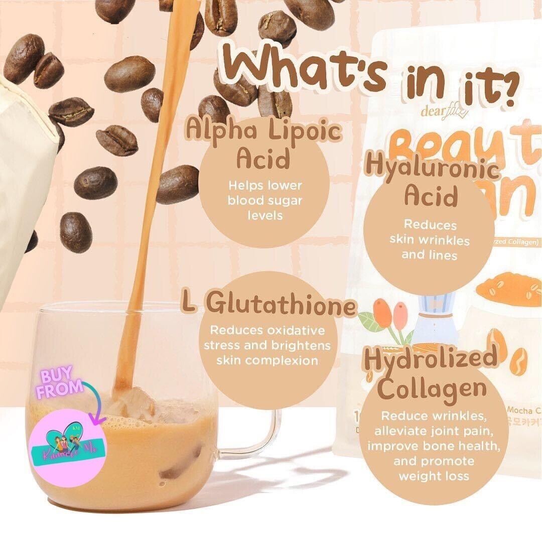 Dear Face BEAUTY BEAN Premium Korean Mocha Coffee, 10 Sachets X 18g.In love with Beauty Milk but also obsessed with coffee? Then get ready for a newcraving because Beauty Bean will take you to an even higher high!! ☺️☕️We only give you the best of the best ingredients from KOREA! Beauty Bean isPremium Korean Mocha flavored and just the right amount of sweetness withoutreal sugar 😋This yummy coffee is a top choice for a slimmer, healthier, & more glowing skinand body!Unlimited beauty in every bean 🫘A coffee addict’s dream ☁️