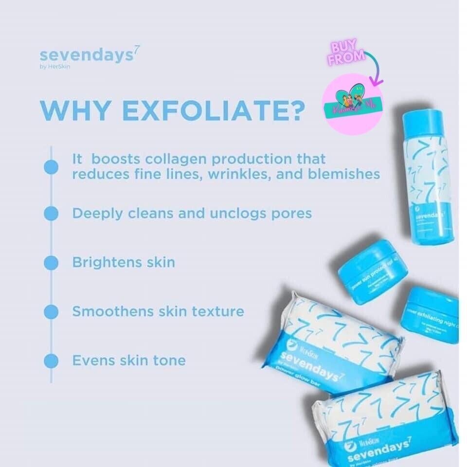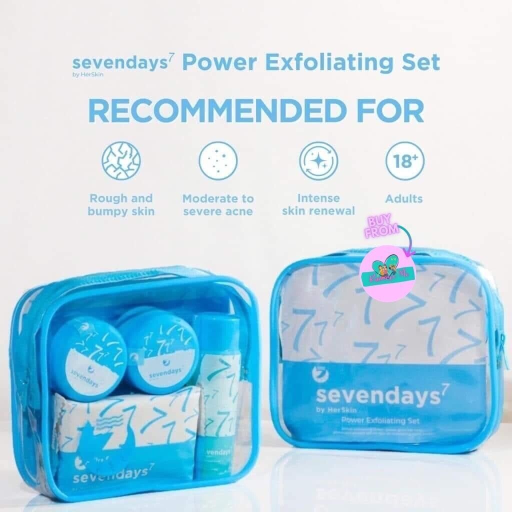 Her Skin Seven Days Power Exfoliating Set.Seven Daysby HerSkinPower Exfoliating SetThis skincare set is formulated to reduce the appearance of fine lines, even outthe skin's texture, and bring out your skin's radiance . With the power ofSalicylic Acid and Glycolic Acid, which are best for the correction of acne andexfoliation of skin, remove your dead skin cells and renew your skin in SevenDays!Set Includes:power glow bar soappower exfoliating tonerpower sun protect with spf40power exfoliating night creamProduct Description:- Seven Days Power Glow Bar - contains niacinamide that minimizes poreappearance keeping skin smooth and moisturized, Helps in the improvement ofhyperpigmentation, dark spots, age spots, and pimple marks.- Seven Days Power Exfoliating Toner - Formulated with Glycolic Acid andSalicylic Acid that fights acne, fades hyperpigmentation, reduces fine lines andwrinkles and exfoliates the skin to get rid of dead skin cells.- Seven Days Power Sun Protect Sunscreen with SPF 40 - Experience a lightweightnon-greasy formulated wtih Aloe Vera extract and Centella asiatica that soothesand calms skin. With SPF40 to protect from harmful UVA and UVB raysSeven Days Power Exfoliating Night Cream - Designed to rejuvenate the skinovernight, Lightens acne scars, pimple marks, dark spots, and improves skintexture.Benefits of coconut oil on your skin:- it soothes irritated skin- it moisturizes your skin- it helps to protect your skin from UV rays- it minimizes the look of fine lines and wrinkles- it has antibacterial and antifungal propertiesPower Glow Bar Soap Contents:Aqua, Coconut Oil, Castor Oil, Kojic Acid, Alpha Arbutin, Sodium Lactate,FragranceDirections for use:STEP 1Wash your face using the Seven Days Power Glow Bar. Gently massage lather onyour skin in a circular motion for 10-15 seconds. Rinse your face with water,pat your face dry using a clean towel.STEP 2Use the Seven Days Power Exfoliating Toner after washing your face with thePower Glow Bar. Dampen a cotton pad and gently swipe it over your face, Allow itto dry. Use twice daily for 1 month.. Rest face for one month before usingagain.STEP 3In the morning, use the Seven Days Power Sun Protect 15-30 minutes before sunexposure. With SPF40 to protect from harmful UVA and UVB rays.At night, apply a thin layer of Seven Days Power Exfoliating Night Cream on faceand blend lightly. Use once a day before bedtime for 1 month. Rest face for onemonth before using again.DISCLAIMER:Applying this product constitutes using it at your own risk, Her SKin is notfamiliar with buyer's skin sensitivity, condition, and history. Her Skin willnot be liable for any negative result from using this product.PRECAUTION:Test the skin for sensitivity to the product prior to use.
